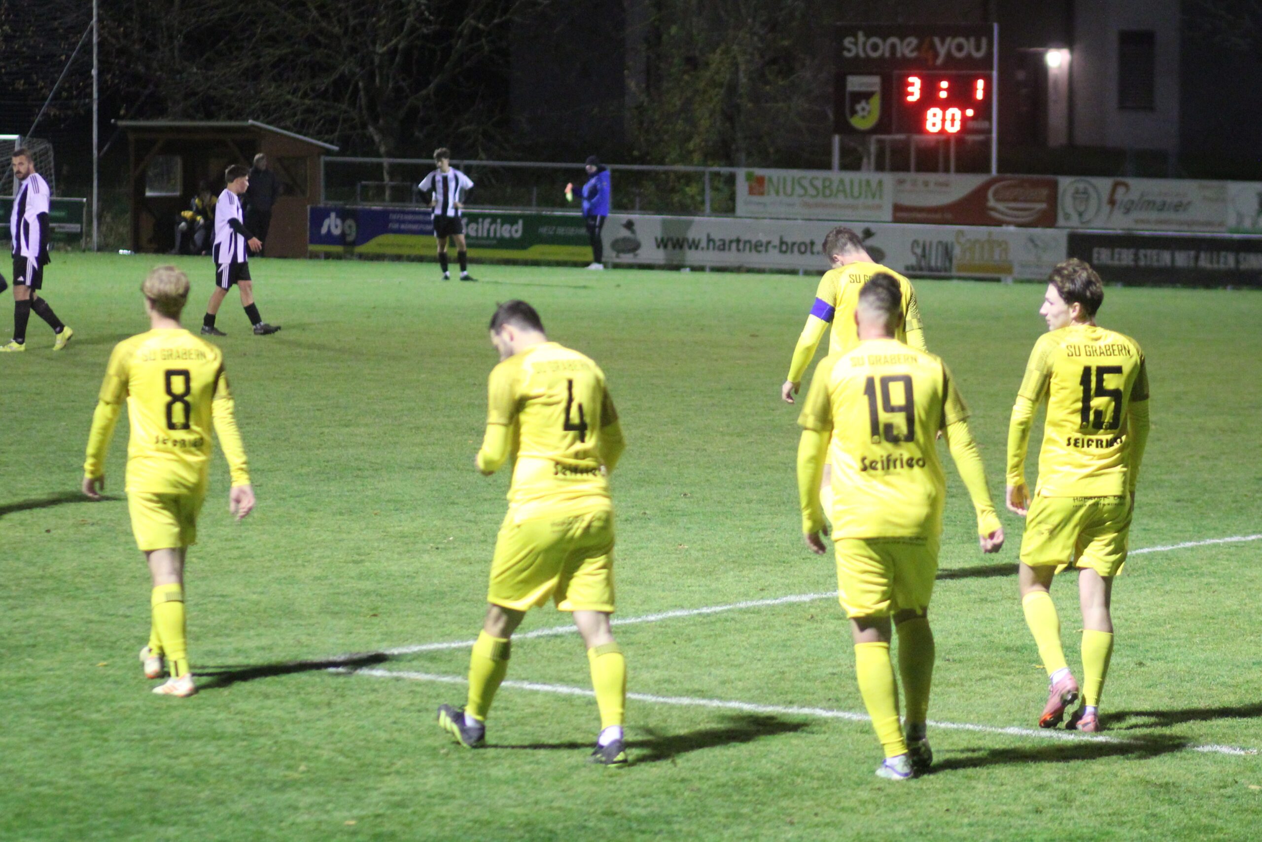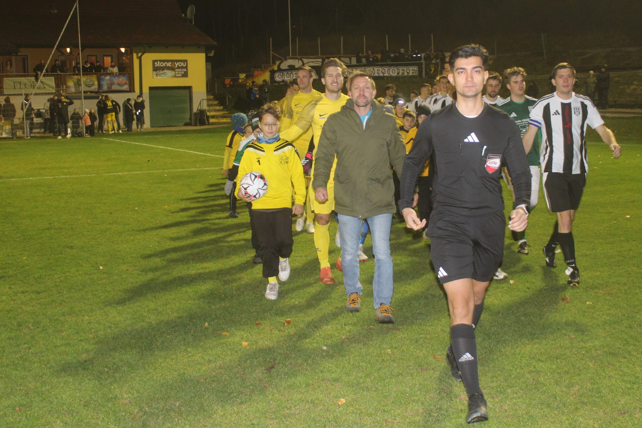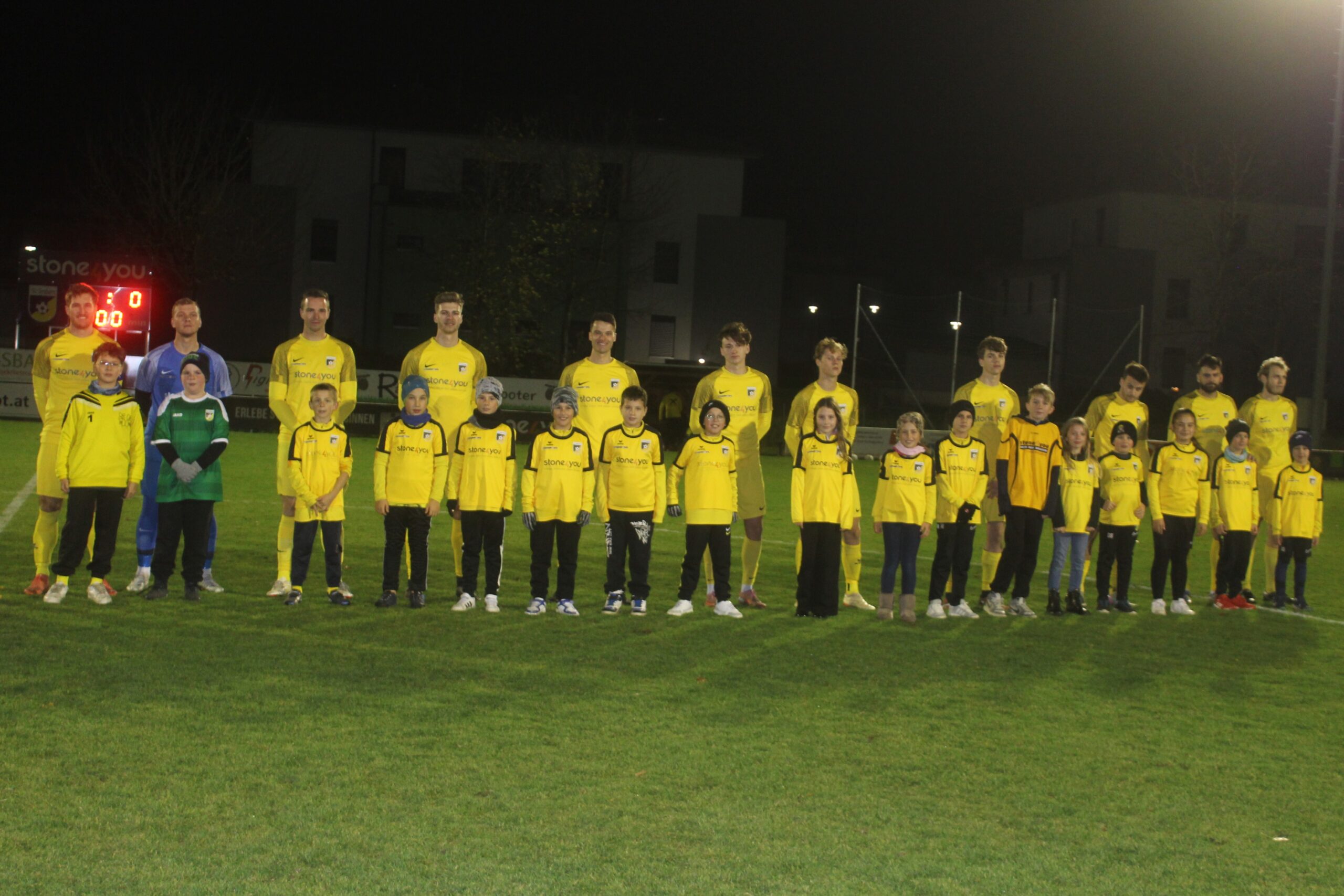 Im letzten Spiel des Jahres wurde unsere Kampfmannschaft von unseren zahlreichen Nachwuchsspielern aufs Spielfeld begleitet und startete gut in die Partie. Nach zehn Minuten brachte Kapitän Dominik Schwabl den Ball scharf zur Mitte. Den abgefälschten und dadurch schwer zu nehmenden Ball verwertete Oliver Schinagl zur Führung. Fünf Minuten später kam Vaclav Vasicek nach einer Ecke an den Ball und baute die Führung mit einem Schuss knapp neben der Stange aus. Da die Gäste danach einmal auf der Linie retten konnten ging es nur mit einer 2:0 Führung in die Pause.